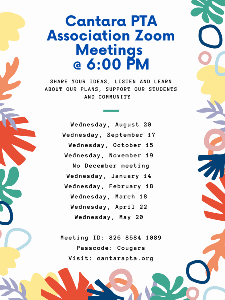 Join us for our PTA Association Zoom meetings. Meet PTA, join PTA, and learn about all the fun programs and events we have planned for our students and community.